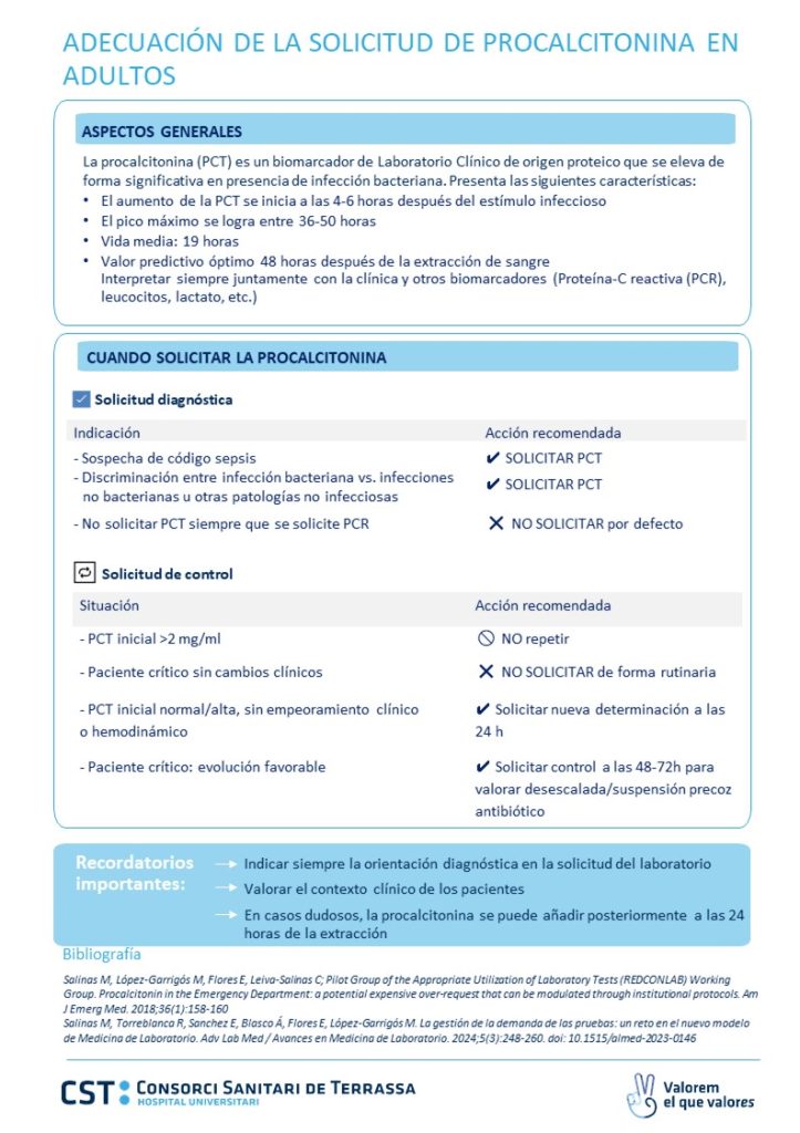 La Comisión de Mejora de la Práctica Clínica del Consorci Sanitari de Terrassa (CMPC-CST) ha puesto en marcha una iniciativa basada en la información y la sensibilización entre los profesionales sobre la “Adecuación de la procalcitonina en adultos”, para favorecer el uso adecuado de la prueba y su correcta interpretación en la práctica clínica.