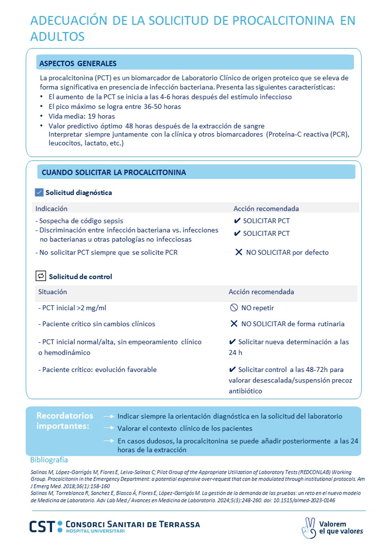 La Comisión de Mejora de la Práctica Clínica del Consorci Sanitari de Terrassa (CMPC-CST) ha puesto en marcha una iniciativa basada en la información y la sensibilización entre los profesionales sobre la “Adecuación de la procalcitonina en adultos”, para favorecer el uso adecuado de la prueba y su correcta interpretación en la práctica clínica.